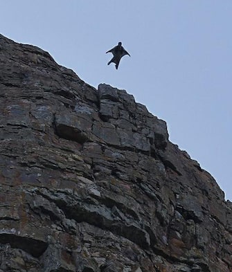 Successivamente vola lontano dalle scogliere con uno slancio in avanti aiutato dalla tuta alare