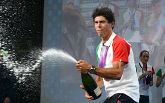 Champagne e ciclismo: un binomio festaiolo già scritto. Qui Marco Aurelio Fontana dopo aver conquistato il bronzo alle Olimpiadi di Londra 2012 -