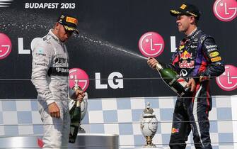 Anche nella Formula 1 lo champagne bagna tutte le feste sul podio. Qui Vettel e Hamilton, primo e terzo nello scorso Gp d'Ungheria -