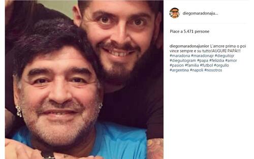 Anche per Diego è stata una giornata speciale: "L'amore prima o poi vince sempre e su tutto! Auguri papà", la dedica del figlio "ritrovato" Diego Junior (foto da Instagram) -