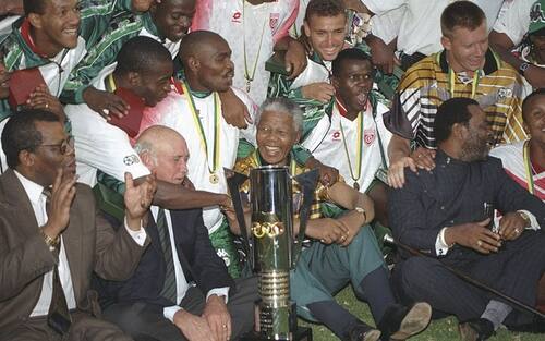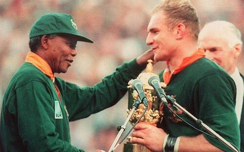 Per parlare di Mandela e lo sport non si può far a meno di partire da questa immagine. Era il 1995. Il Sudafrica si sta lentamente mettendo alle spalle le scorie dell’apartheid. E questo momento ha in sé una forte carica simbolica. Gli Springboks vincono il mondiale organizzato in casa e Mandela, con tanto di maglia e cappellino della nazionale, consegna il trofeo nelle mani del capitano della squadra François Pienaar. La cavalcata vincente del Sudafrica nel 1995, con tutti i suoi significati extrasportivi, è diventata un film, "Invictus", grazie al regista Clint Eastwood. Protagonisti: i premi Oscar Matt Damon e Morgan Freeman –