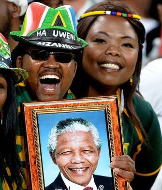 Tifosi del Sudafrica allo stadio per tifare i Bafana Bafana nel 2010 con in mano un immancabile quadro di Mandela -