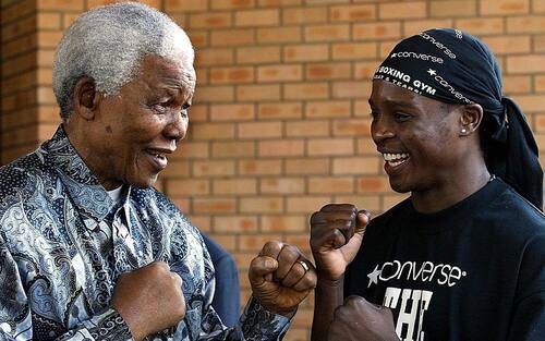 Mandela, in una foto del 2003, ride e scherza con il campione di boxe sudafricano, Phillip N'dou -
