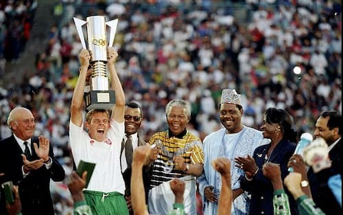 Ma Mandela non è stato solo rugby. Madiba ha legato il suo nome anche al calcio. Era il 1996, un anno dopo l’impresa degli Springboks, e il Sudafrica sportivo, assieme al suo leader, si prende un’altra soddisfazione: organizzare e, per la prima volta, vincere la Coppa d’Africa –