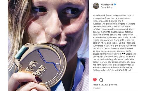 L'azzurra ha compiuto una rimonta leggendaria - unica di sempre a riuscire ad andare a podio in sette finali consecutive - battendo le favoritissima Ledecky e l'australiana McKeon (foto da Instagram) -