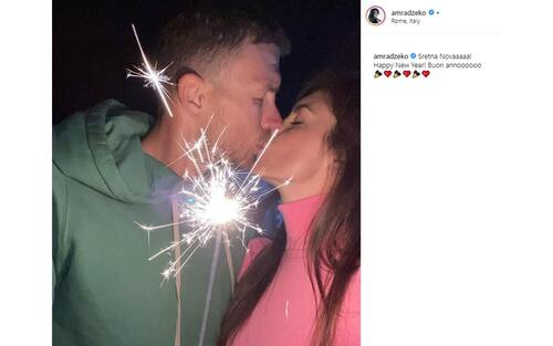 Il bacio di "benvenuto" al 2020 dell'attaccante bosniaco della Roma Edin Dzeko e della moglie Amra (foto da Instagram)