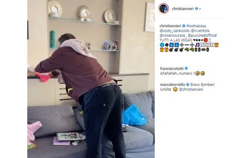 Il bomber per eccellenza alla prese con l'aspirapolvere... (foto Instagram @costy_caracciolo)