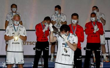 Mascherine, guanti e il "piatto" dei vincitori rigorosamente sanificato: così i campioni di Germania del THW sono stati premiati in una Sparkassen Arena deserta, senza la possibilità di far festa con i propri tifosi per le limitazioni causate dalla pandemia. La Handball-Bundesliga si era fermata per il Covid-19 all'inizio di aprile con il club di Kiel in testa al campionato