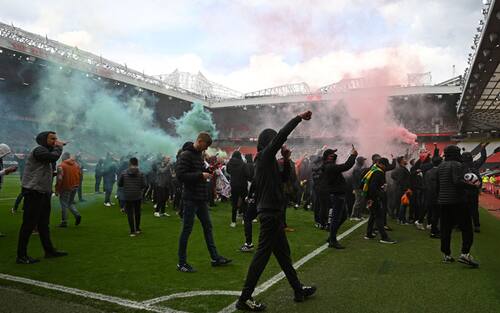 2 maggio 2021. I tifosi del Manchester United invadono Old Trafford prima del match di Premier League contro il Liverpool, protestando contro i proprietari del club che hanno aderito, insieme ad altre 5 società inglesi, alla SuperLega. Appena 48 ore dopo la formazione, lo United e gli altri club britannici si sono auto esclusi dalla Super Lega