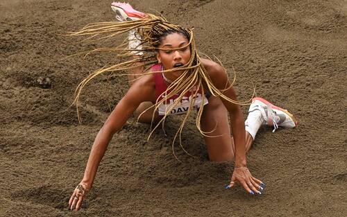 3 agosto 2021. La statunitense Tara Davis atterra nella sabbia durante la finale di salto in lungo allo Stadio Olimpico di Tokyo