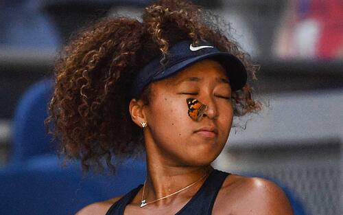 12 febbraio 2021. Una farfalla si posa sul naso della tennista giapponese Naomi Osaka durante un cambio campo nel match contro la tunisina Ons Jabeur nel 5° giorno degli Australian Open 2021 di tennis a Melbourne