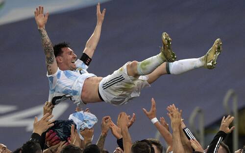 10 luglio 2021. Lionel Messi portato in trionfo dai compagni dopo il successo dell'Argentina nella Copa America 2021: decisivo l'1-0 nella finale del Maracanà contro i padroni di casa del Brasile. La 'Pulce' interrompe la maledizione che lo voleva eterno secondo con l'albiceleste