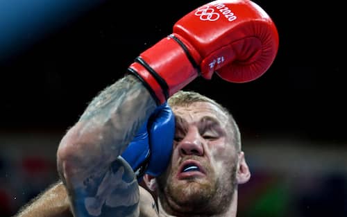 25 luglio 2021. Il croato Luka Plantic riceve un pugno dal rivale giordano Odai Riyad Adel Alhindawi durante il match dei pesi leggeri (75-81 kg) valido per il torneo olimpico di boxe di Tokyo 2020 alla Kokugikan Arena