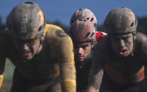 3 ottobre 2021. Corridori nel fango durante la 118^ edizione della Parigi-Roubaix, vinta dall'italiano Sonny Colbrelli