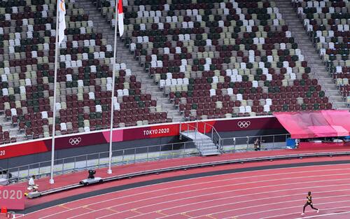 23 luglio 2021. Un poliziotto assiste alla Cerimonia di apertura dei Giochi Olimpici di Tokyo 2020 allo Stadio Olimpico della capitale giapponese, che si è svolta a porte chiuse. Tutta l'Olimpiade è proseguita senza pubblico a causa della pandemia Covid-19