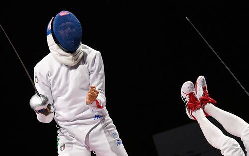 25 luglio 2021. Enrico Garozzo reagisce alla caduta del giapponese Koki Kano falls durante il torneo individuale di spada ai Giochi di Tokyo 2020