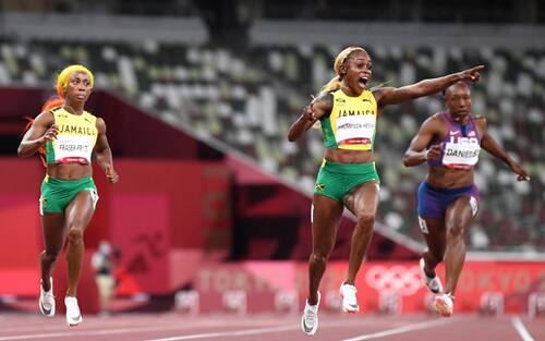 31 luglio 2021. La giamaicana Elaine Thompson-Herah esulta dopo aver tagliato il traguardo da vincitrice dei 100 metri femminili, davanti alla connazionale Shelly-Ann Fraser-Pryce