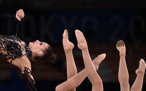 7 agosto 2021. Il Team dell'Ucraina durante la prova di qualificazione all-around di ginnastica ritmica all'Ariake Gymnastics centre di Tokyo