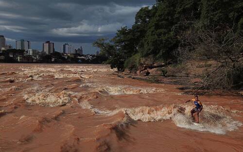 9 gennaio 2021. Il surfista brasiliano Paulo Guido surfa sul fiume Doce a Governador Valadares, in Brasile. Con l'arrivo della stagione delle piogge a Minas Gerais, il livello del Doce cresce e favorisce la pratica del surf, non essendo frequentato da imbarcazioni