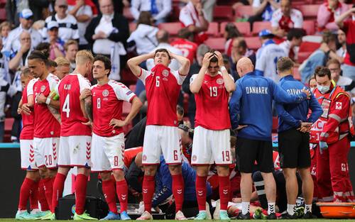 12 giugno 2021. I giocatori della Danimarca si stringono in cerchio intorno al centrocampista Christian Eriksen, vittima di un attacco cardiaco durante il match di Euro 2020 al Parken Stadium di Copenhagen