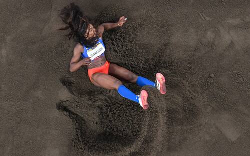 30 luglio 2021. L'atterraggio della colombiana Katerine Ibarguen durante le qualificazioni nel salto triplo all'Olympic Stadium di Tokyo