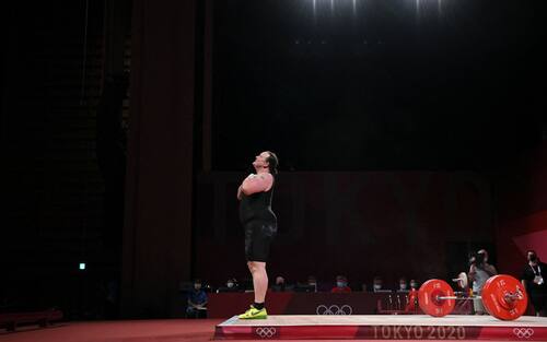 2 agosto 2021. La prima atleta trangender a partecipare ai Giochi, la neozelandese Laurel Hubbard, esulta dopo la sua prova nella categoria +87 kg del sollevamento pesi al Tokyo International Forum