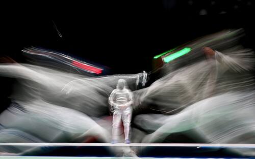 24 luglio 2021. Luca Curatoli tira contro il romeno Iulian Teodosiu nel torneo di sciabola maschile alla Makuhari Messe Hall di Chiba City, durante i Giochi di Tokyo 2020