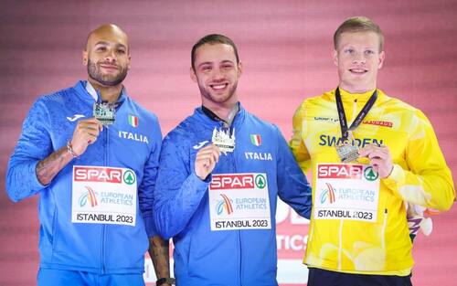- Sul podio, al fianco di Ceccarelli, è salito Marcell Jacobs, medaglia d'argento. "Caro Samu, è la tua medaglia più bella...per ora" ha detto lo sprinter nato El Paso. Un incoraggiamento da capitano, anche in vista dei prossimi impegni: "Devi renderti conto di quello che hai fatto, essere consapevole di quanto puoi correre forte e trasformarlo nelle gare all'aperto".