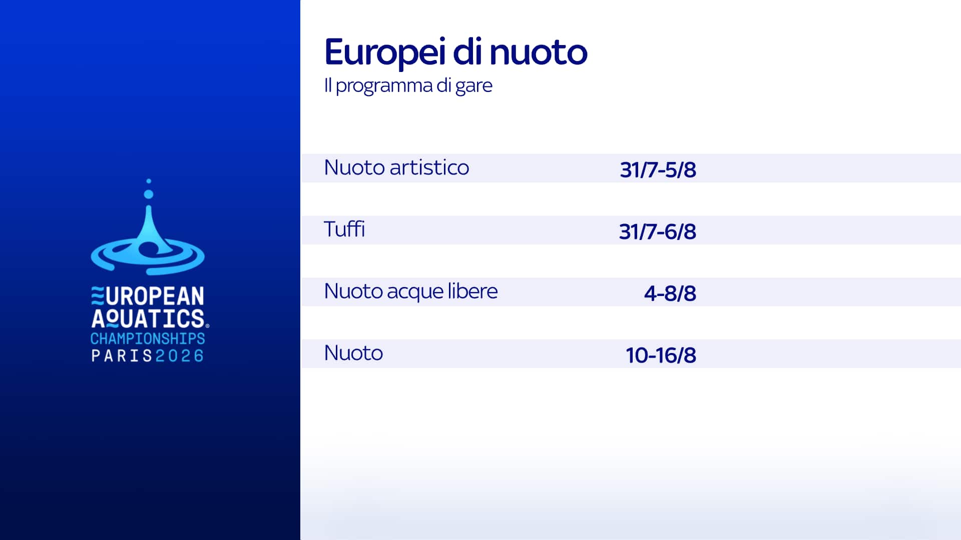 l'annuncioIn arrivo un altro grande evento nella Casa dello Sport: Sky ha acquisito i diritti di trasmissione della 38esima edizione dei Campionati Europei di Nuoto, in programma a Parigi dal 31 luglio al 16 agosto 2026. Su Sky e NOW oltre due settimane di competizioni con le 5 discipline acquatiche