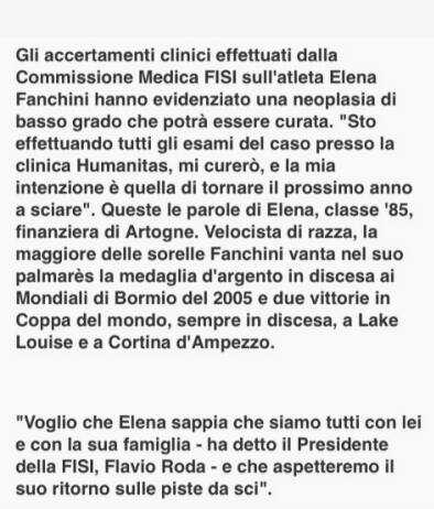 Elena Fanchini si ferma per un serio problema di salute, rivelato dalla 32enne bresciana su Instagram: "A tutti é capitato di affrontare momenti difficili, momenti in cui la vita ci mette a dura prova. La vita mi ha messo davanti ad una nuova sfida, una cosa seria per cui sono costretta a fermarmi per curarmi. Non é facile perché penso a tutti i sacrifici, alla fatica, agli obiettivi della stagione, alle olimpiadi e ai miei sogni. Tutto scivola via come pioggia. Questa é la vita, non sai mai cosa può succedere, ma io non mi arrendo, affronto questa nuova sfida con tanta forza e coraggio per tornare più forte e realizzare i miei sogni." La conferma è arrivata anche dalla Fisi con un comunicato: "Gli accertamenti clinici effettuati dalla commissione medica hanno evidenziato una neoplasia di basso grado che potrà essere curata". Elena, dovrà dunque rinunciare alla sua quarta partecipazione ai Giochi olimpici. Era rientrata a inizio anno dopo un'operazione al ginocchio subita a marzo. In coppa del Mondo vanta 4 podi, con 2 vittorie, l'ultima nella discesa di Cortina d'Ampezzo del gennaio di due anni fa.