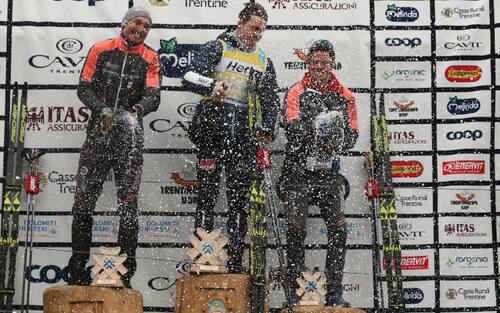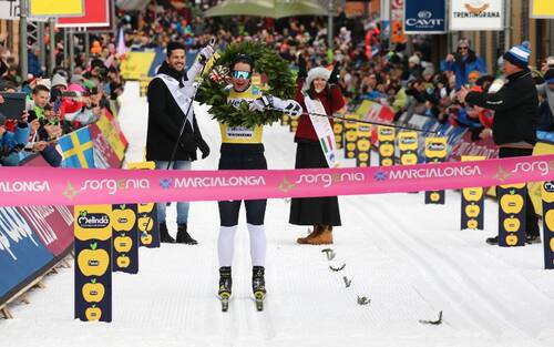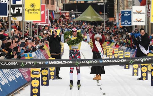 Emozioni da traguardo nell'ultima edizione: il campione norvegese Petter Eliassen taglia il traguardo di Cavalese e viene incoronato vincitore con la corona di alloro (2019)