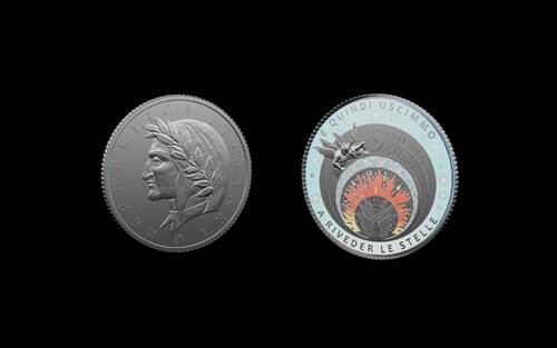 DANTE ARGENTO - Omaggio a un altro genio italiano, a 700 anni dalla sua scomparsa. Sul dritto c'è il profilo del poeta e scrittore, ispirato da un’opera di Sandro Botticelli. Nel giro la scritta “REPUBBLICA ITALIANA”, chiusa da una stella. Più particolare il retro, con la rappresentazione stilizzata dell’inferno dantesco con i nove gironi descritti nella Divina Commedia: raffigurati le ali del diavolo, il fuoco e il ghiaccio. Moneta emessa dal valore di 5 euro