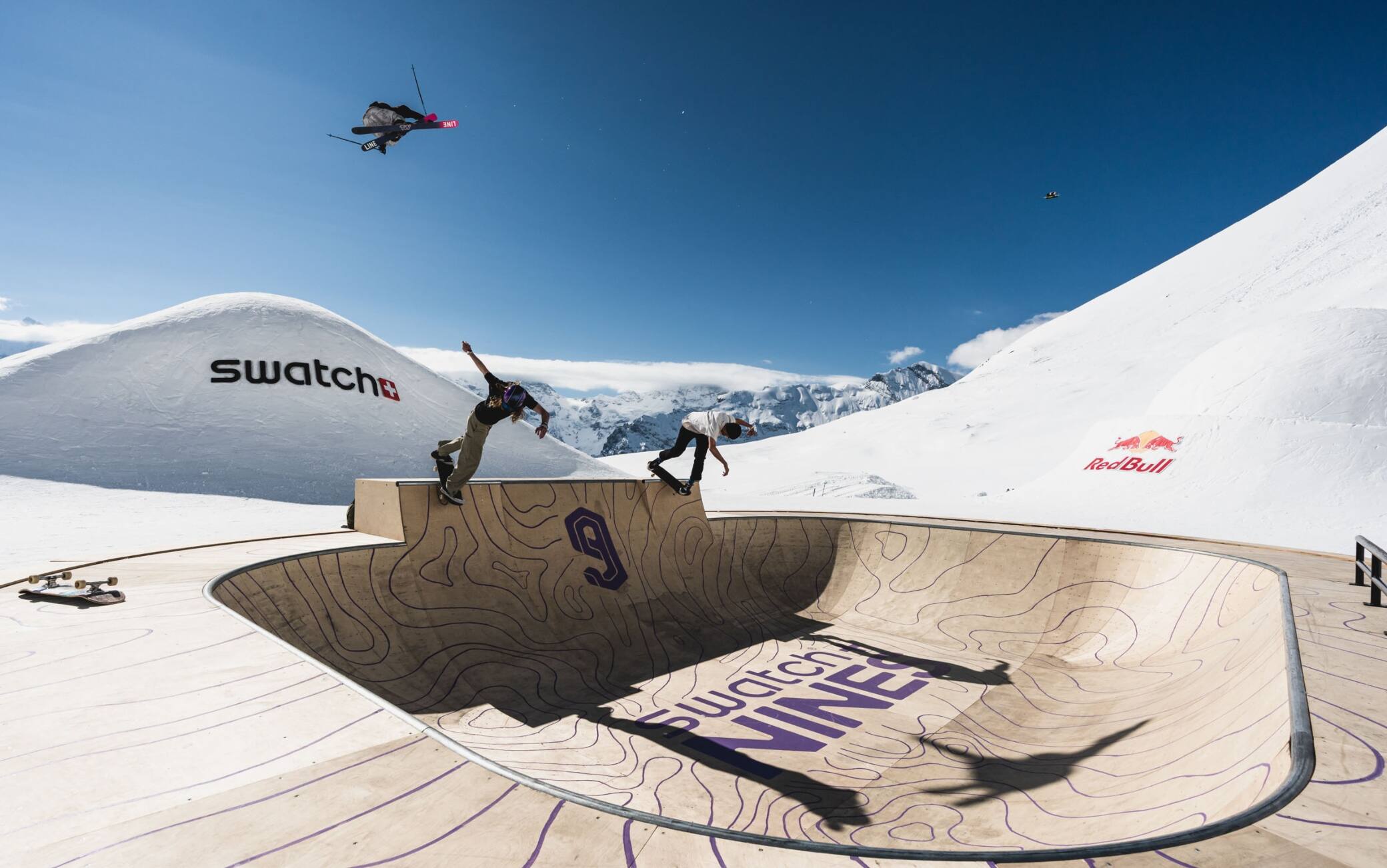 Nato nel 2009, The Nines (si chiama così perché alla prima edizione parteciparono nove atleti e nove è considerato nel Regno Unito un numero fortunato) nasce con un chiaro obiettivo: essere l'antagonista delle competizioni tradizionali, come un parco giochi in cui gli atleti possono progredire nel modo più sicuro possibile. E proprio il setup sviluppato sulle nevi elvetiche, con la vista panoramica dell'iconico Eiger, Monch e Jungrafu, ricorda un luna park: da una parte tre rampe per il big air, sotto un gruppo triangolare di transizioni, cupole e tunnel soprannominato "Skate Complex" visto che al centro è stato posto uno skate bowl in legno, unico nel suo genere. Un progetto sviluppato in un brainstorming di tre giorni nel quartier generale di Swatch, in Svizzera. "Venticinque persone attorno a un tavolo, forse qualcuno neanche ha dormito la notte. Abbiamo sviluppato questo evento dalla A alla Z" ammette Alain Villard, CEO di Swatch. Per costruire le strutture, sono poi servite tre settimane di lavoro: 18 persone all'opera, lo stesso team che ha allestito il setup dello snowboard alle Olimpiadi di Pyeongchang 2018 e Pechino 2022.