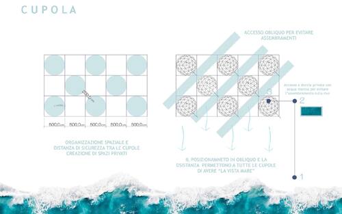Ogni cupola sarà posizionata in maniera semiobliqua, in modo da avere la vista mare. Per evitare assembramenti a riva, le cupole saranno inoltre dotate internamente di docce e vasche di acqua marina