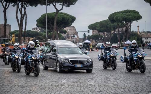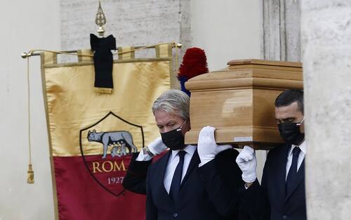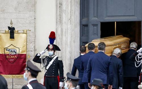 È una Roma in lutto, quasi irreale, silenziosa e senza traffico, quella che ha accompagnato l'ultimo viaggio di Gigi Proietti, l'immenso mattatore, scomparso il 2 novembre a 80 anni, proprio nel giorno del suo compleanno e nel pieno, però, della pandemia. I funerali dell'attore sono stati celebrati, inevitabilmente, in forma privata, nella chiesa degli Artisti di Piazza del Popolo, con l'immancabile drappo giallorosso della sua amata squadra.