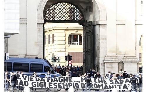 C'è anche lo striscione dei tifosi della Roma che campeggia in Piazza del Popolo: "Me viè da piagne...ma che sarà... Ciao Gigi, esempio di romanità".