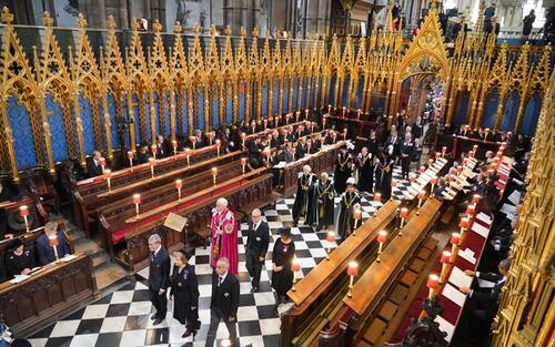 Il reverendo David Hoyle ha aperto la liturgia dopo il canto di un primo inno solenne, ricordando con la voce inizialmente incrinata dall'emozione il valore simbolico dell'abbazia di Westminster nella lunga vita di Elisabetta II. Tra gli inni cantati nel 1947 durante il matrimonio tra Elisabetta e Filippo il Salmo 23, 'Il Signore è mio pastore, non manco di nulla", riproposto oggi durante il funerale.
