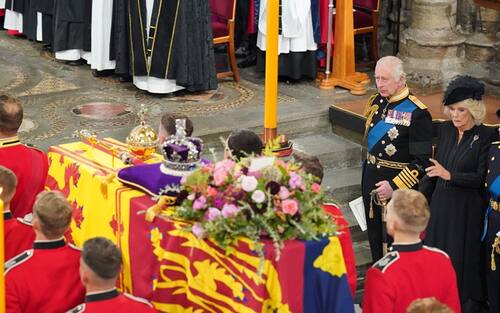 "In ricordo amorevole e devoto. Charles R.". Così recita il biglietto di Carlo III nella corona di fiori posta sulla bara della Regina, durante il funerale, come nella tradizione della monarchia britannica ('R'. a significare 'Rex' in latino nei documenti ufficiali).