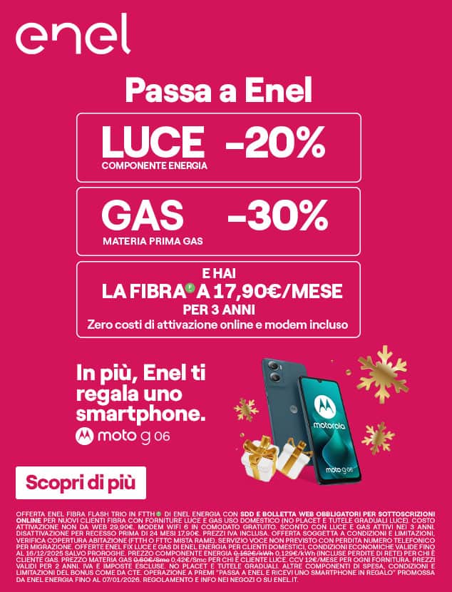 Proprio attraverso il nuovo numero 140 è attivabile immediatamente anche l’offerta luce, gas e fibra, disponibile fino al 7 gennaio. L’offerta include: sconto di ingresso sulla componente energia e una tariffa particolarmente vantaggiosa per la fibra ottica. Nel dettaglio, viene proposto uno sconto del 20% sulla componente energia e del 30% sulla materia gas per due anni in caso di attivazione di entrambe le commodity. A questo si aggiunge la fibra Enel al prezzo bloccato per tre anni di 17,90 € al mese, con modem incluso e zero costi di attivazione. Inoltre, per chi aderisce all’offerta, Enel regala un Motorola Moto G06. Le offerte si possono attivare tramite tutti i canali di contatto, dagli store Enel al nuovo servizio telefonico dedicato, chiamando il 140. Tutte le informazioni di dettaglio sono disponibili anche sul sito di enel.it (Offerte Enel Fix Luce e Gas di Enel Energia soggette a condizioni e limitazioni. Operazione a premi fino al 07.01.2026. Regolamento completo su enel.it. Offerta Fibra in FTTH con SDD e bolletta web obbligatori).