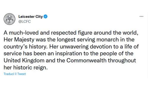 - "Siamo profondamente addolorati nell'apprendere della scomparsa di Sua Maestà la Regina. Insieme a molti dei nostri tifosi oggi, ci prenderemo del tempo per piangere e riflettere sull'incredibile vita e sul servizio devoto di Sua Maestà"
