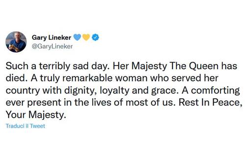 - "Che giornata terribilmente triste. Sua Maestà la Regina è morta. Una donna davvero straordinaria che ha servito il suo Paese con dignità, lealtà e grazia. Una presenza confortante nella vita della maggior parte di noi. Riposa in pace, Maestà"