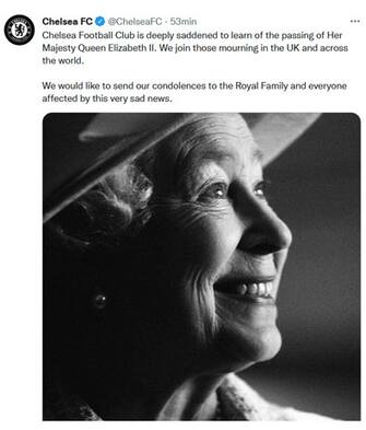 - "Il Chelsea Football Club è profondamente rattristato nell'apprendere della morte di Sua Maestà la Regina Elisabetta II. Ci uniamo al lutto nel Regno Unito e in tutto il mondo. Vorremmo porgere le nostre condoglianze alla Famiglia Reale ea tutti coloro che sono stati colpiti da questa tristissima notizia."