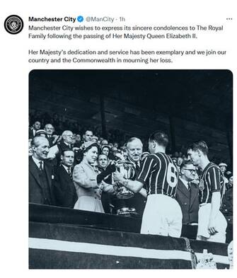 - "Il Manchester City desidera esprimere le sue più sincere condoglianze alla famiglia reale dopo la morte di Sua Maestà la Regina Elisabetta II. La dedizione e il servizio di Sua Maestà sono stati esemplari e ci uniamo al nostro Paese e al Commonwealth nel piangere la sua perdita"