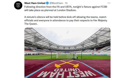 - Tra le squadre inglesi in campo la sera della morte della regina Elisabetta, il West Ham impegnato in Conference League annuncia che "Seguendo le indicazioni di FA e UEFA, la partita di stasera contro l'FCSB si svolgerà come previsto al London Stadium. Prima del calcio d'inizio si terrà un minuto di silenzio che consentirà alle squadre, agli ufficiali di gara e a tutti i presenti di rendere omaggio a Sua Maestà la Regina