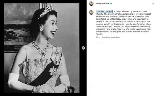 - "Sono veramente rattristato per la morte di Sua Maestà, la Regina. [...] Quanto ci sentiamo tutti devastati oggi mostra cosa ha significato per le persone in questo Paese e in tutto il mondo. Quanto ci ha ispirato con la sua leadership. Come ci ha confortato quando i tempi erano duri. Fino ai suoi ultimi giorni ha servito il suo Paese con dignità e grazia. [...]. I miei pensieri e le mie preghiere sono con la nostra Famiglia Reale". Questo il pensiero di Beckham su Instagram
