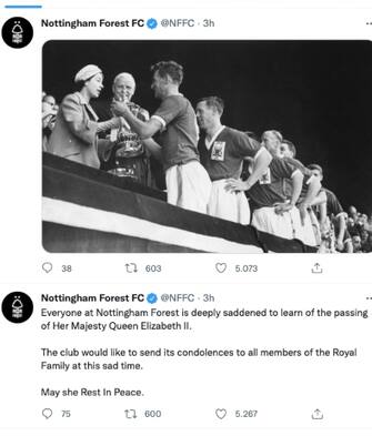 - "Tutti al Nottingham Forest sono profondamente rattristati dalla notizia della morte di Sua Maestà la Regina Elisabetta II. Il club esprime le sue condoglianze a tutti i membri della Famiglia Reale in questo momento così triste. Che riposi in pace", scrive il club su Twitter