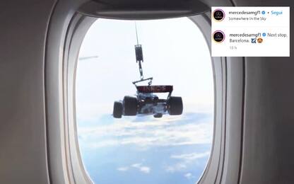 Fondo Mercedes, la W14 sospesa fuori dall'aereo... IRONIA SOCIAL Divertente post su Instagram della Mercedes: la W14 appesa a un cavo fuori da un aereo nel... 01 giu - 12:58