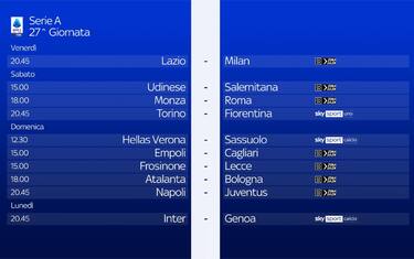 Il calendario della 27^ giornata di Serie A guida tv Da venerdì 1^ a lunedì 4 marzo su Sky e in streaming su NOW la ventisettesima giornata, con 3... 01 mar - 09:00