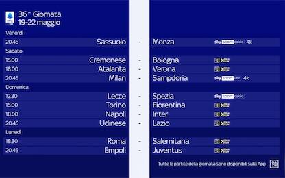 Il calendario della 36^ giornata di Serie A guida tv In campo per la trentaseiesima giornata dal 19 al 22 maggio 2023. Da oggi, venerdì 19 a lunedì 22... 19 mag - 09:00