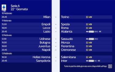 La presentazione della giornata di Serie A guida tv La 22^ giornata di Serie A si apre venerdì 10 e si chiude lunedì 13 febbraio con Sampdoria-Inter,... 09 feb - 15:00
